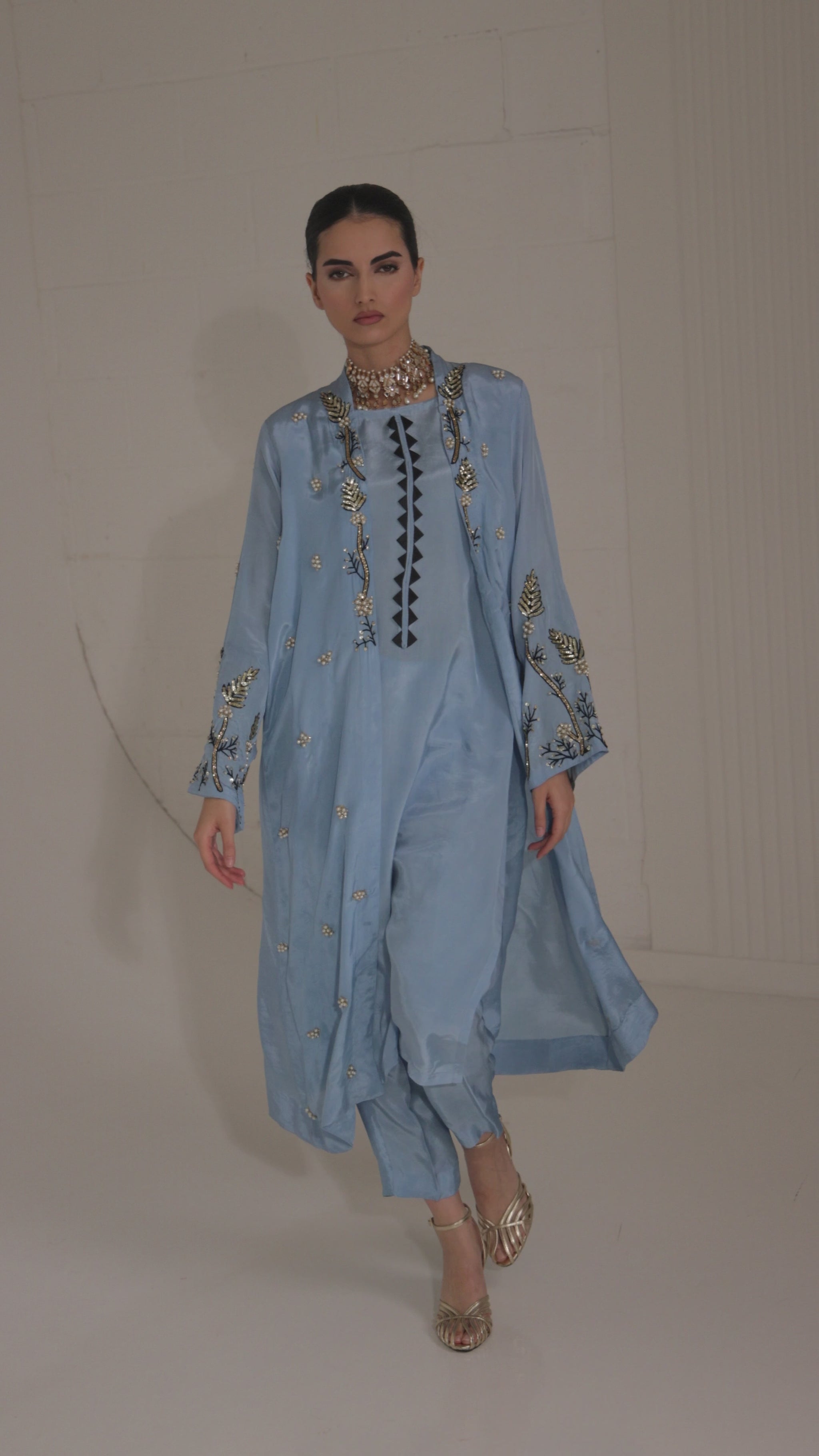 Elevate your festive and formal wardrobe with this exquisite powder blue three-piece set. Crafted from lustrous silk, the ensemble features a straight-cut kurta adorned with delicate pearl and gold hand embroidery, creating a graceful play of shimmer against the soft blue base. Intricate floral and leafy motifs cascade along the front and sleeves, adding richness without overwhelming the clean silhouette.