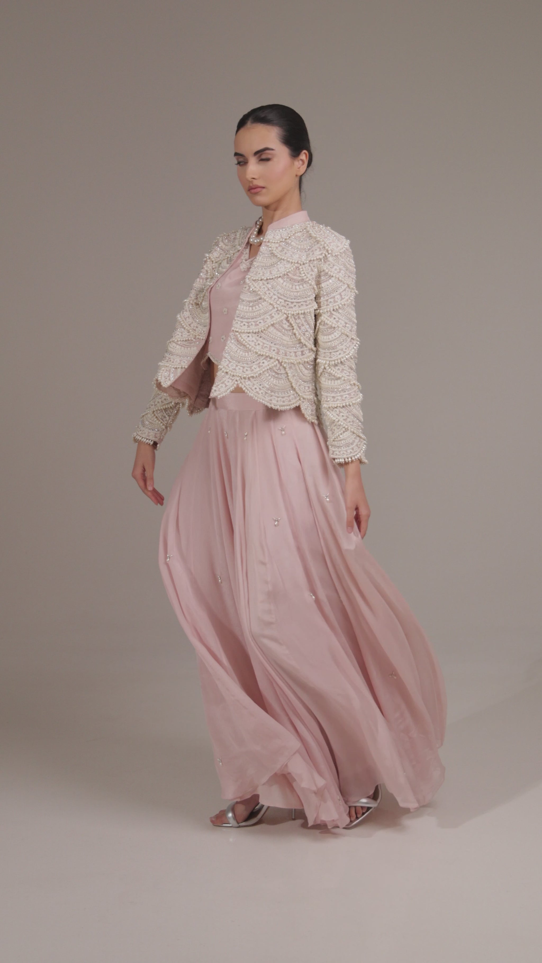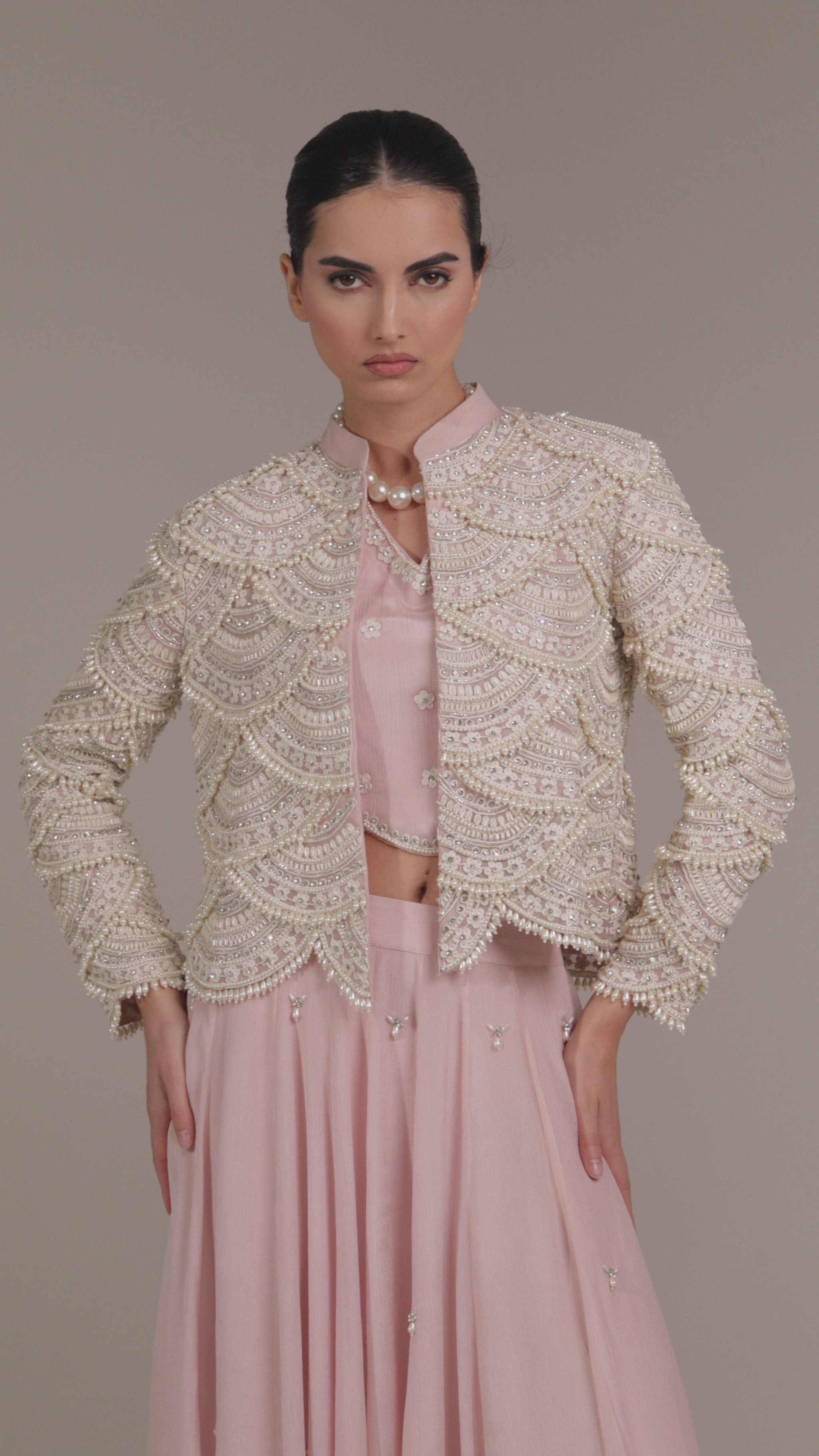 The ensemble features a beautifully tailored jacket, adorned with intricate hand embroidery, showcasing delicate patterns inspired by traditional motifs. Every stitch is meticulously placed by skilled artisans, highlighting the artistry of fine needlework. The highlight of the piece is the opulent use of luxurious pearls, arranged in elegant scalloped layers across the jacket, adding dimension, texture, and a regal charm that is both rare and refined.