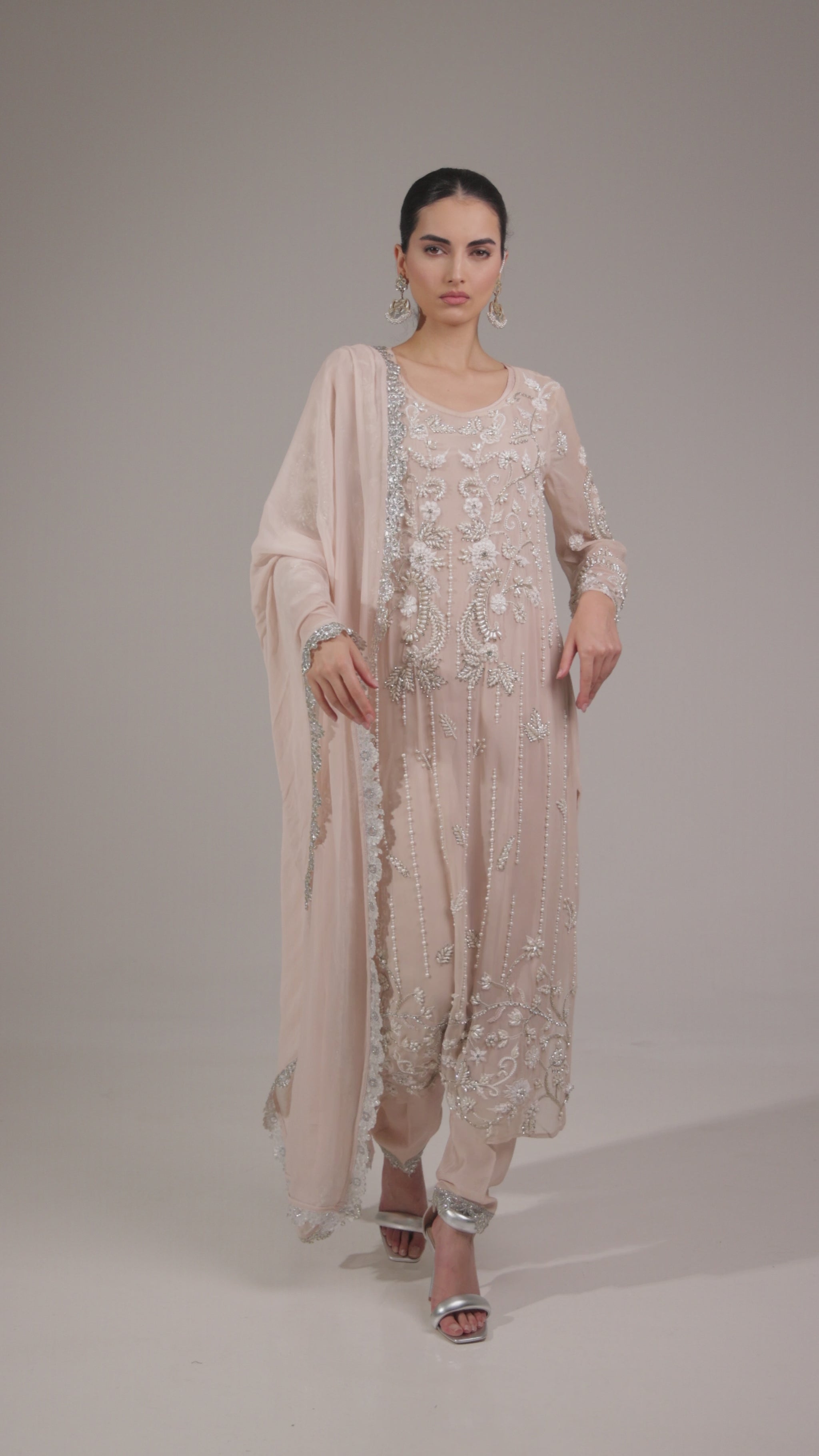 Softly romantic and exquisitely detailed, this blush pink kurta suit captures the essence of modern femininity with a timeless touch. The ensemble features delicate white floral embroidery gracefully tracing the georgette, each bloom brought to life with hand-applied pearl embellishments that shimmer with quiet elegance.