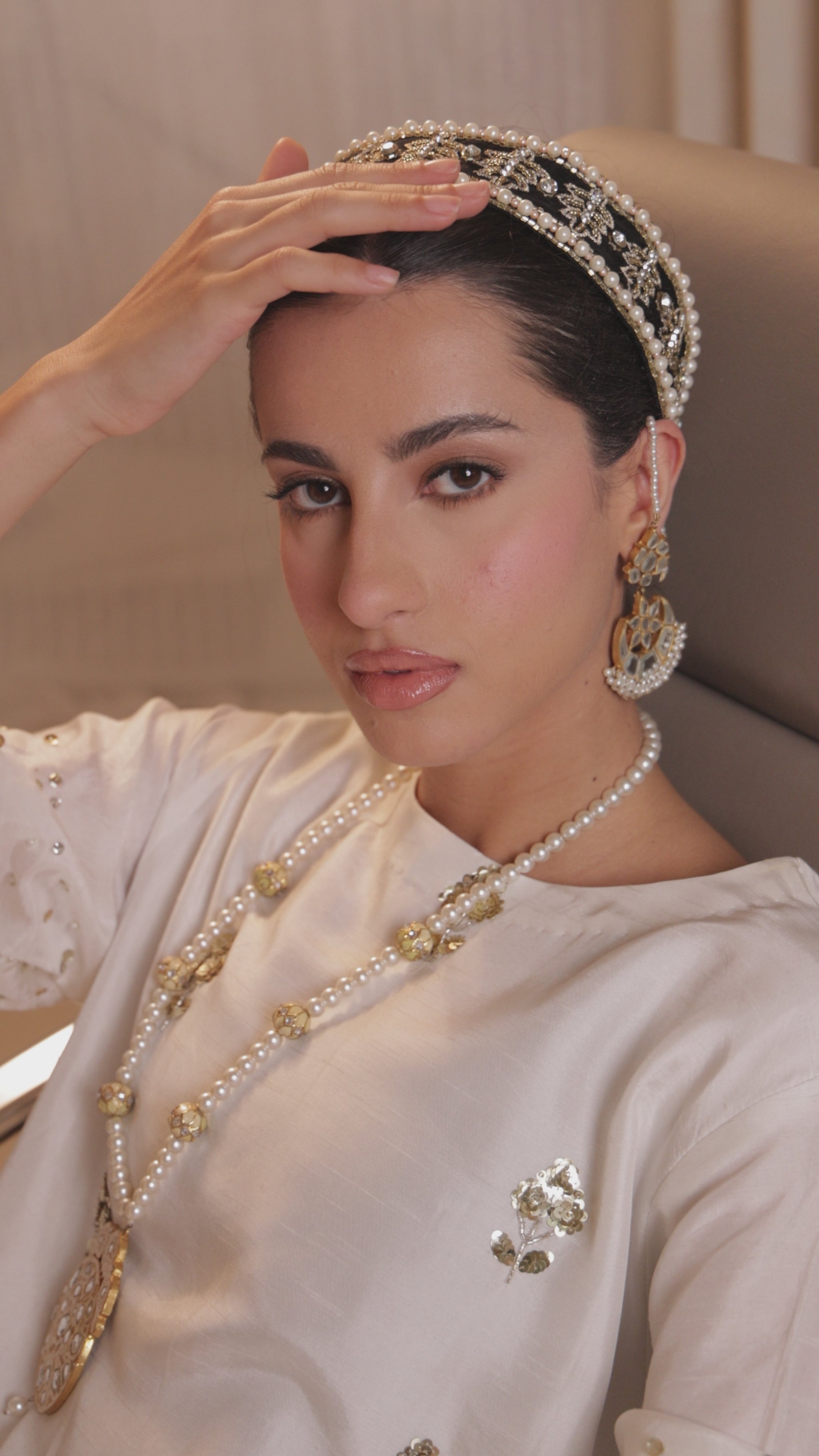 Graceful in its simplicity, this White Diyah Maxi embodies modest sophistication and timeless elegance. Crafted from lustrous silk-blend fabric, the gown features delicate gold hand embellishments scattered across the front, adding a subtle shimmer that catches the light without overpowering the look.